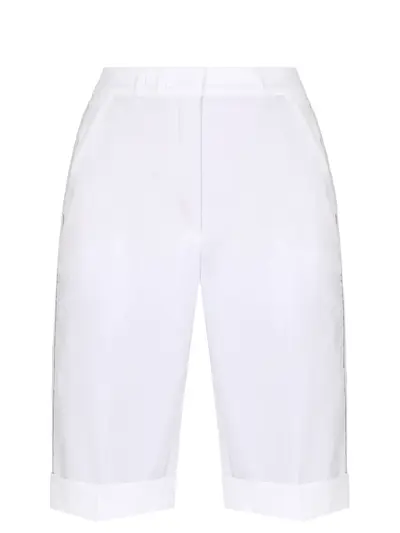 -Полуприлегающий силуэт, средняя посадка, пояс, шлевки, прорезные карманы, отвороты в нижней части брючин, боковые лампасы в виде контрастных полос, стрелки для придания силуэту большей графичности, застежка-молния.