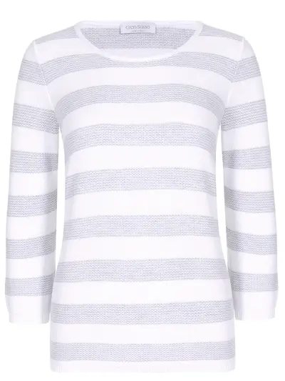 -Легкий джемпер из хлопка в широкую полоску в серо-белой цветовой гамме от GRAN SASSO. -Полуприлегающий силуэт, укороченные рукава длины 3/4, узкие рельефные манжеты и пояс, круглый вырез горловины.
