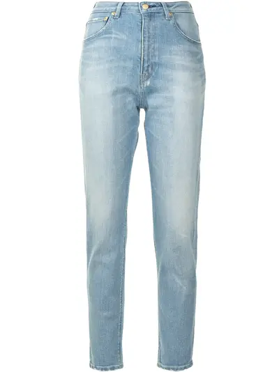 light blue cotton distressed finish high waist classic five pockets front button and zip fastening straight leg