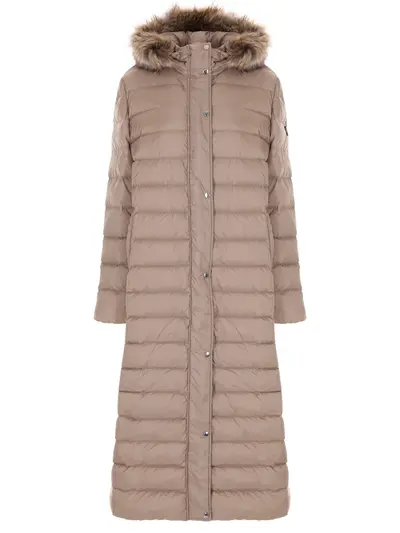 -Бежевый удлиненный стеганый пуховик от PAUL&SHARK. -Расклешенный к низу крой, классическая горизонтальная стежка, прорезные карманы, основная застежка-молния и кнопки, капюшон на кулиске с отделкой искусственным мехом.