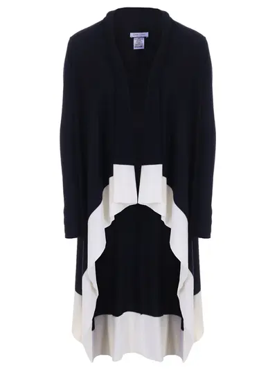 -Кардиган из темно-синей тонкой шерсти от GRAN SASSO. -Асимметричный по длине спинки крой, свободный запах пол, длинные рукава, широкая контрастная отделка подола.