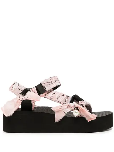 black/pink/white bandana print raw edge open toe round toe strap detailing flatform sole