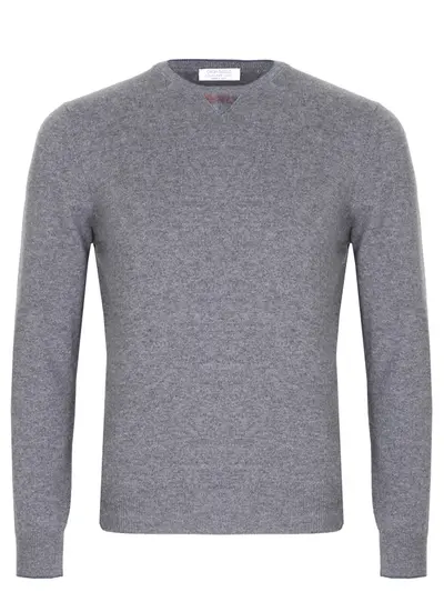 -Серый джемпер от GRAN SASSO. -Модель выполнена из смеси шерсти, кашемира и вискозы. -Круглый вырез горловины с треугольной вставкой, длинные рукава с патчами на локтях, эластичные манжеты и пояс по низу изделия.