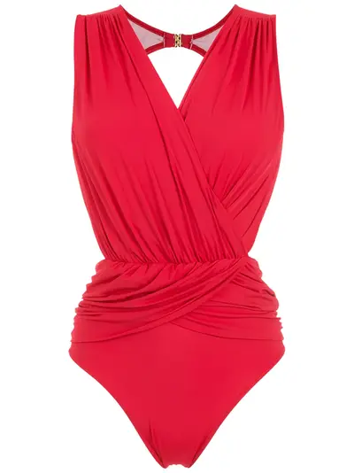 red stretch-design open back gathered detailing rear buckle fastening round neck sleeveless Be mindful to try on swimwear over your own garments.