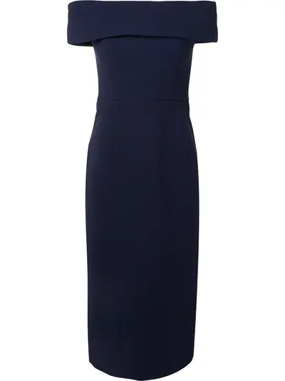 navy blue rear zip fastening off-shoulder fitted silhouette mid-length