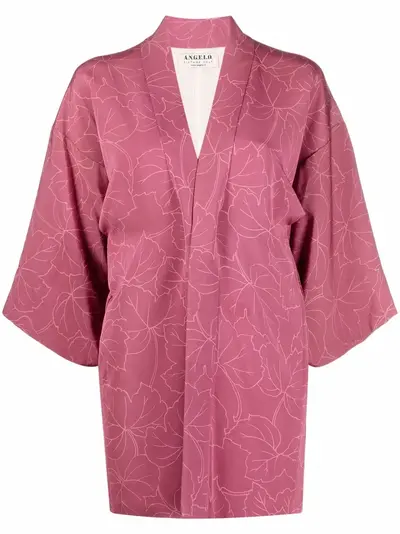 circa 1970s petal pink silk leaf print shawl lapels no fastening drop shoulder three-quarter length square sleeves thigh-length straight hem
