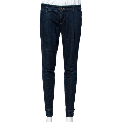 These jeans from Gucci are designed to exude a chic vibe. The dark blue denim jeans exhibit a tapered silhouette and come equipped with a front button and zip closure and four pockets. They will look great with simple tops and ballet flats.