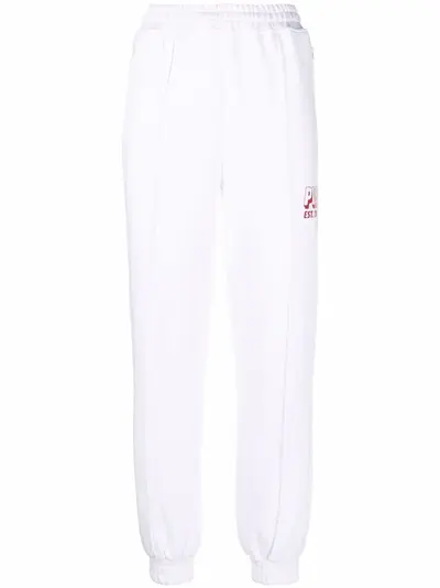white cotton logo print to the front elasticated waistband pleat detailing two side inset pockets elasticated ankles