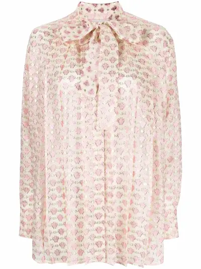 pastel yellow/multicolour patterned jacquard pussy-bow collar fully pleated long sleeves