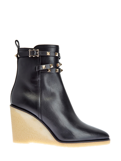 Ботильоны Rockstud от Valentino Garavani созданы из гладкой телячьей кожи с эффектом глянцевой полировки. Присущий бренду стиль глэм-рок подчеркивают фирменные заклепки с платиновым напылением. Подкладка из овчины делает модель особенно актуальной для составления зимних образов. Детали: танкетка с эффектом каучуковой поверхности, застежки-молнии, заостренный мысок. Сделано в Италии.