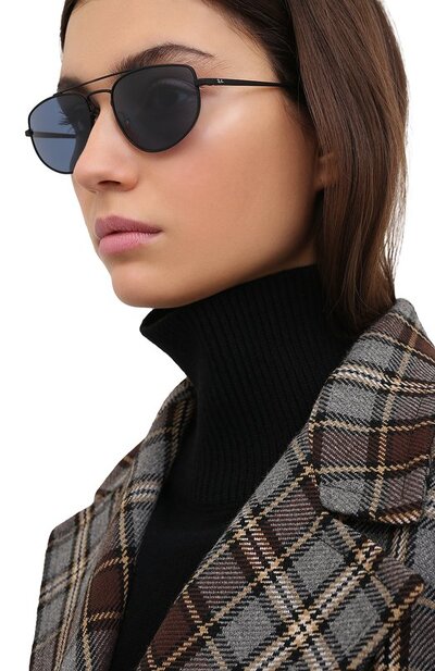 Солнцезащитные очки с синими линзами со степенью затемнения 3N и полной защитой от UV-лучей добавят цветовой акцент сдержанному образу. Для изготовления аксессуара использовали легкий ювелирный сплав с матовым покрытием, который дизайнеры марки назвали Rubber black. Изделие с двойным мостом декорировали неброским логотипом бренда на узких дужках.