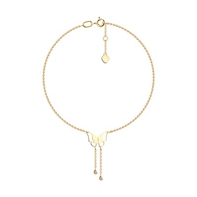Браслет на щиколотку из золота с фианитами подчеркнёт красоту ваших ножек. Бабочка – символ лёгкости и свободы. Этот интригующий аксессуар добавит пикантности любому наряду, подчеркнёт красоту и изящество загорелых ножек. При этом его можно носить и с обувью на каблуке, и мокасинами, и вовсе без обуви.
