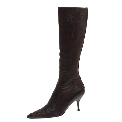 These stylish high boots by Prada are a must have. Crafted in Italy, they are made of quality leather and comes in a lovely shade of brown. They have been styled simply and feature 8 cm heels, leather lining, insoles, and soles. They are easy to slip into and will instantly transform every outfit they are paired with.