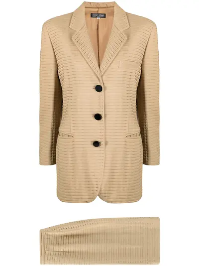 circa 1990s sand beige cotton-blend Jacket: ribbed detailing notched lapels front button fastening long sleeves buttoned cuffs jetted chest pocket two front welt pockets Skirt: high waist concealed fastening knee-length Please be mindful that this piece has led a previous life, and may tell its story through minor imperfection. Condition: GOOD. This previously owned and used item is in good condition with minimal signs of use. This may include fading of material or plating and scratches.