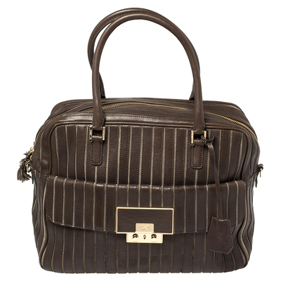 This stylish Bowling bag by Anya Hindmarch has been designed to assist you with ease and style on all days. Crafted using leather and suede, the bag has a striped exterior in brown and grey. It is complete with two handles, a shoulder strap, and a spacious fabric interior.