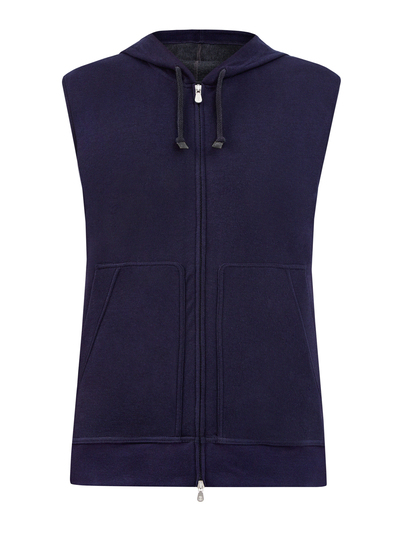 Лаконичный мужской жилет из коллекции для путешествий Travelwear от Brunello Cucinelli выполнен из интерлока — плотной хлопковой ткани с текстурой джерси с обеих сторон. Эластичный дышащий материал обеспечивает максимальный комфорт в движении. Посадка по фигуре достигается за счет эластичной нижней кромки. Детали: капюшон на кулиске, накладные карманы, застежка-молния. Сделано в Италии.