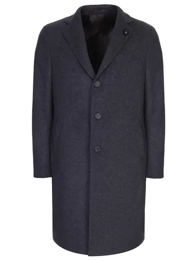 -Классическое пальто темно-серого цвета от Lardini. -Модель выполнена из шерсти и кашемира. -Прямой крой, отложной воротник с лацканами, листочка, длинные рукава, прорезные карманы, шлица, застежка-пуговицы.