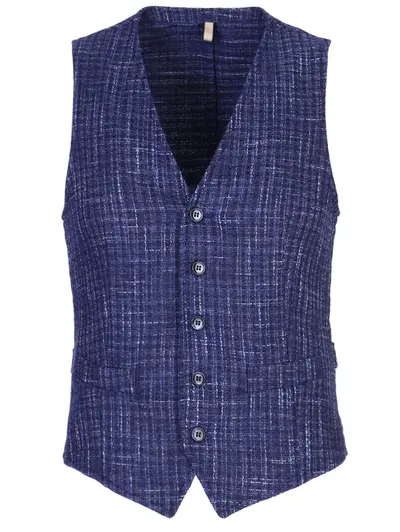 -Фактурный жилет классического кроя от L.B.M. 1911. -Модель выполнена из смешанного состава на основе шерсти. -V-образный вырез, прорезные карманы, застежка на пуговицы. -Ремешок на спинке позволяет регулировать посадку по фигуре. -Маркировка R.