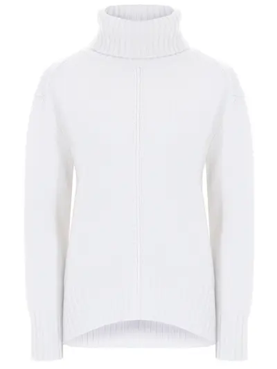 -Белый свитер из кашемира от LORENA ANTONIAZZI. -Свободный силуэт, длинные рукава, эластичные широкие манжеты, пояс и высокий ворот с отворотом с широкой рельефной обвязкой.