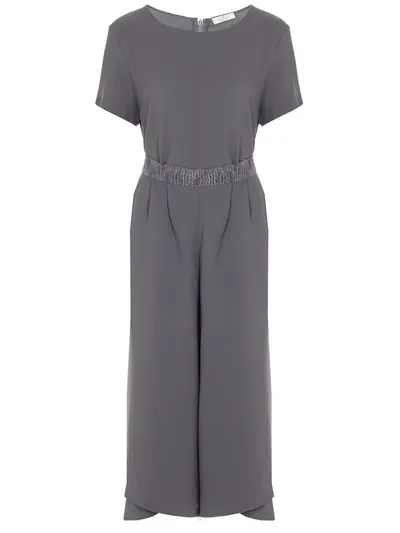 -Серый однотонный комбинезон из вискозы от PANICALE. -Акцент в виде пояса на талии, короткие рукава, круглый вырез горловины, широкие укороченные брюки на манер кюлотов, застежка-молния на спинке.