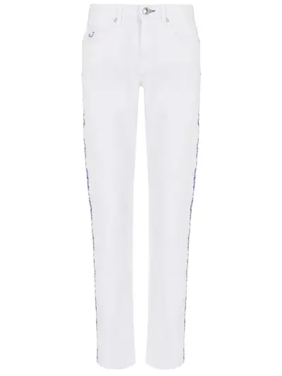 -Белые джинсы из плотного хлопка от JACOB COHEN. -Средняя посадка, пояс, шлевки, прорезные и накладные карманы, застежка-молния и пуговица, нашивка с логотипом бренда. -Декор боковых швов-лампасов брендированной лентой, потертости.