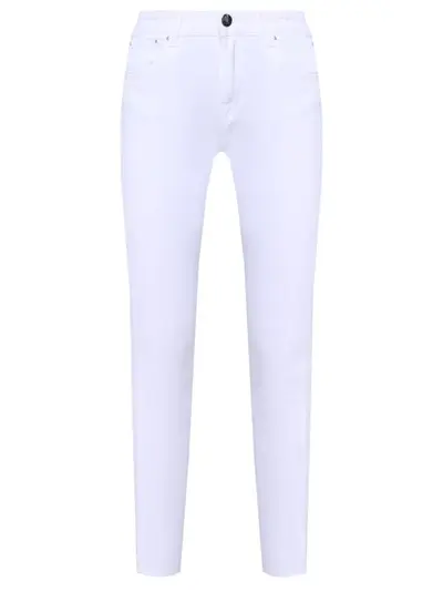 -Зауженные джинсы от JACOB COHEN. -Модель выполнена в белом цвете. -Два прорезных и три накладных кармана, шлевки, средняя посадка, застежка - молния, пуговица.