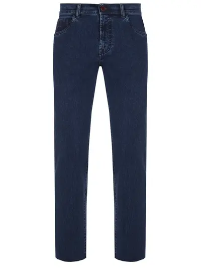 -Синие джинсы из хлопка от SCISSOR SCRIPTOR. -Средняя посадка со шлевками на поясе, прорезные и накладные карманы, застежка-молния и пуговица. -Модель Regular Fit.