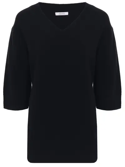 -Черный пуловер из шерсти от DOROTHEE SCHUMACHER. -Свободный силуэт, спущенная линия плеча, укороченные рукава длины 1/2, рельефные манжеты, пояс и V-образный вырез горловины.