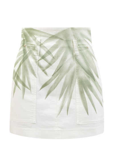 Юбка-мини от Lorena Antoniazzi выполнена из эластичного хлопкового денима. Особенностью изделия стал макро-принт в виде пальмовых листьев в технике аэрографии. Завышенная линия талии и крой с вытачками обеспечивают посадку точно по фигуре. Детали: матовая фурнитура золотистого оттенка, застежка-молния на спинке, широкие петли для ремня. Сделано в Италии.