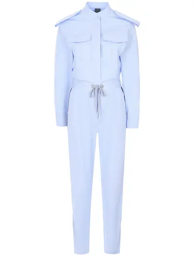 -Голубой комбинезон из легкого хлопка от LORENA ANTONIAZZI. -Оригинальная модель с эполетами, которые сразу обращают на себя внимание, приталенный силуэт с кулиской на талии, длинные рукава, нагрудные накладные карманы, контрастные боковые лампасы.