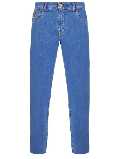 -Хлопковые джинсы синего цвета от SCISSOR SCRIPTOR. -Средняя посадка со шлевками на поясе, прорезные и накладные карманы, застежка-молния и пуговица. -Модель Regular Fit.
