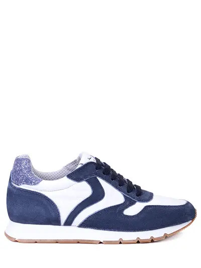 -Комбинированные кроссовки из замши и текстиля в сине-белой цветовой гамме от VOILE BLANCHE. -Классическая форма, закругленный прорезиненный носок, толстая белая подошва, функциональная шнуровка, контрастный задник с декором глиттером.
