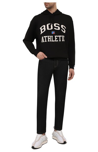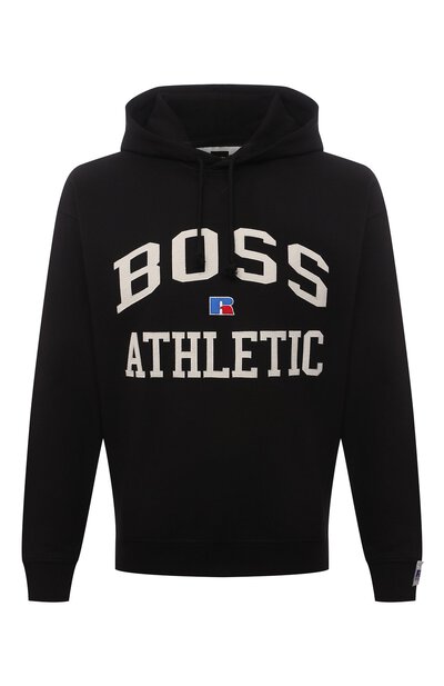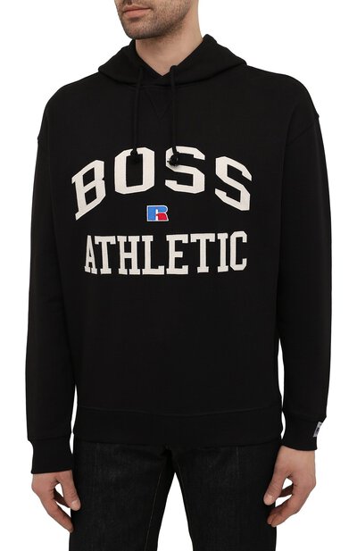 В капсульную коллекцию, созданную вместе с командой Russell Athletic, вошло прямое черное худи. Для пошива модели мастера марки, основанной Хуго Фердинандом Боссом, использовали мягкий дышащий футер из органического хлопка, выращенного и обработанного без применения химикатов и с меньшим расходом воды по сравнению с обычной технологией. Спереди – крупная аппликация в виде логотипов двух брендов.