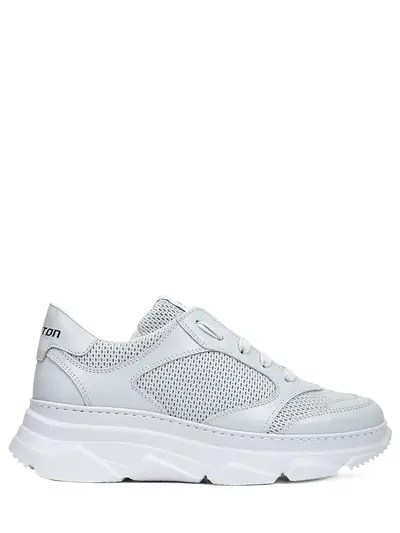 -Серо-зеленые кроссовки из гладкой и перфорированной кожи от STOKTON. -Массивная модель на толстой резиновой подошве, закругленный носок, функциональная шнуровка, высокий задник, язычок с логотипом, внутренняя отделка из кожи и текстиля.