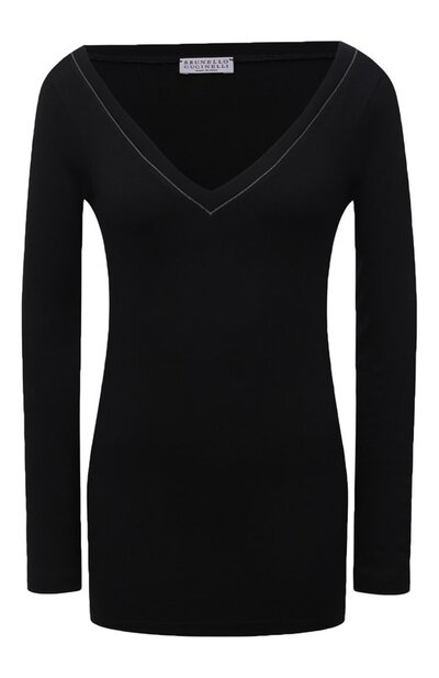 Черный пуловер из осенне-зимней коллекции легко получит звание одной из самых универсальных вещей в гардеробе. В ней будет комфортно весь день. Нежное джерси из хлопка позволяет коже дышать и мягко облегает фигуру благодаря эластичным волокнам в составе. Дизайнеры марки, основанной Брунелло Кучинелли, акцентировали внимание на глубоком V-образном вырезе знаковой цепочкой мониль.
