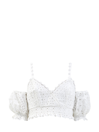 Легкий укороченный топ Silvana из круизной коллекции Charo Ruiz Ibiza выполнен в белоснежном оттенке. Дышащий материал на основе хлопка и кружевная отделка broderie anglaise делают модель идеальной для составления пляжных или повседневных образов. Открытые плечи и тонкие бретели завершают женственный дизайн.