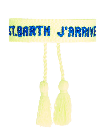 Плетеный браслет от MC2 Saint Barth. Аксессуар выполнен из хлопковой нити и за счет своей текстуры органично дополнит любой пляжный или повседневный аутфит. Изделие представлено в пастельном желтом оттенке, контрастный принт-леттеринг вышит в объемной технике. Регулирующие ширину завязки с кисточками вносят фирменный расслабленный акцент.