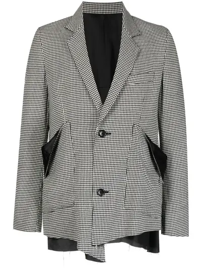 black/white wool blend asymmetric design houndstooth pattern raw-cut edge notched lapels chest welt pocket two front patch pockets buttoned cuffs long sleeves rear slit
