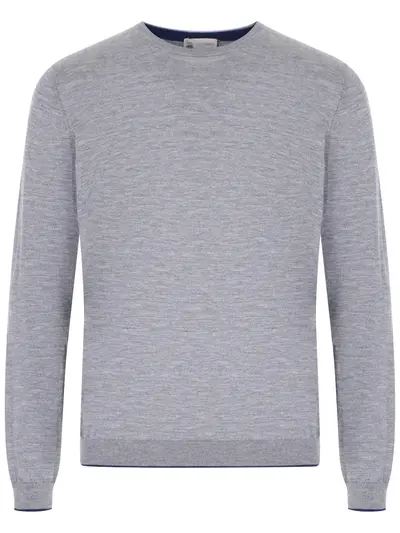 -Джемпер серого цвета от COLOMBO. -Модель выполнена из комбинации кашемира и шелка. -Круглый вырез горловины, длинные рукава, эластичные манжеты и пояс по краю изделия с контрастной окантовкой.