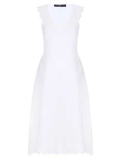-Белое платье из легкого рами от HIGH. -Модель свободного кроя длины миди, пояс на завязках по спинке, чтобы Вы могли сами выбрать акцент на талии или более свободный силуэт, круглый вырез горловины, отделка подола вышивкой.