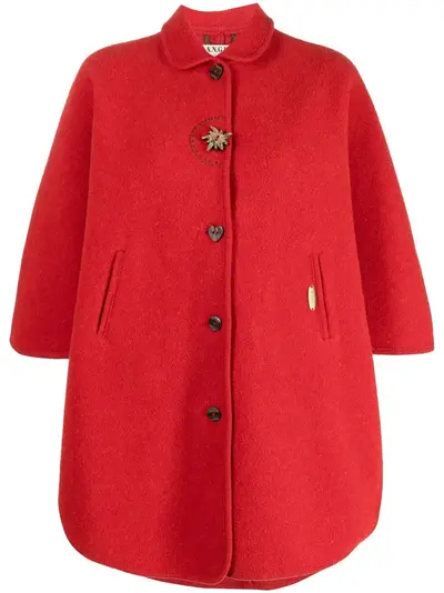 circa 1980s bright red virgin wool club collar front button fastening star and heart motif buttons three-quarter length sleeves two front welt pockets curved hem no lining Condition: GOOD. This previously owned and used item is in good condition with minimal signs of use. This may include fading of material or plating and scratches.