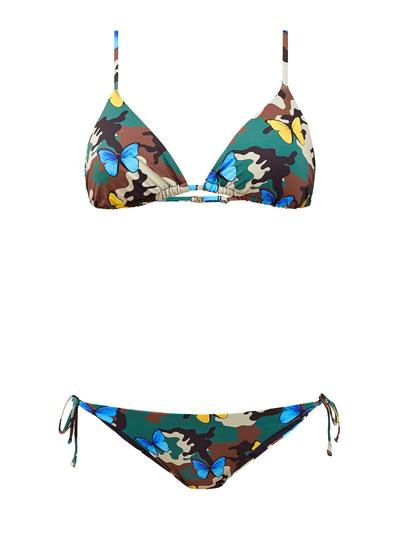 Лиф от MC2 Saint Barth. Для создания модели была выбрана быстросохнущая эластичная ткань, устойчивая к выгоранию на солнце. Камуфляжный мотив дополнен принтом в виде бабочек и смягчает настроение в стиле милитари. Детали: конструкция без поролоновых вставок и косточек, металлическая застежка на спинке.
