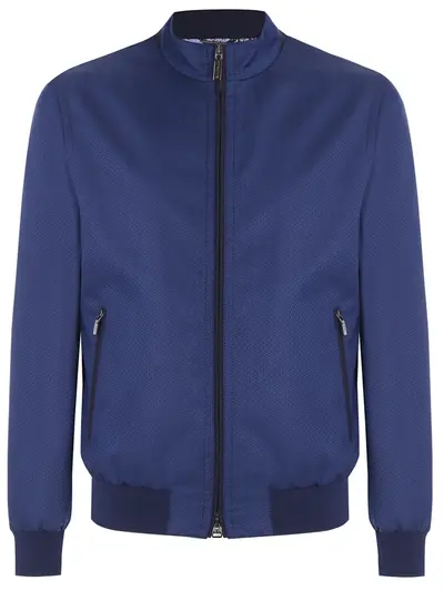 -Синий бомбер с микроузором из шерсти и хлопка от HETTABRETZ. -Воротник-стойка, длинные рукава, эластичные манжеты и пояс по низу изделия, прорезные карманы на молнии, застежка-молния.