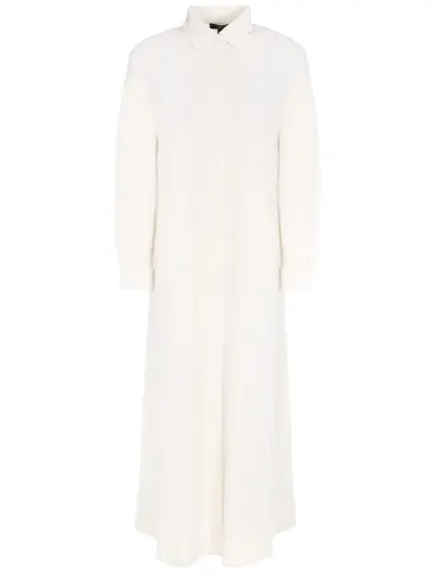 -Платье-рубашка из смесовой вискозы кремового цвета от RE VERA. -Свободный крой, длина миди, спущенная линия плеча, длинные рукава с манжетами, отложной воротник, супатная застежка на пуговицы.