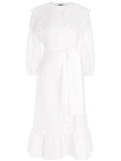 -Модель прямого кроя, приталенная поясом в тон, укороченные рукава длины 3/4 с эластичными манжетами на резинке, круглый вырез горловины, грудь оформлена вышивкой, расклешенная юбка-миди с отделкой широкой оборкой.