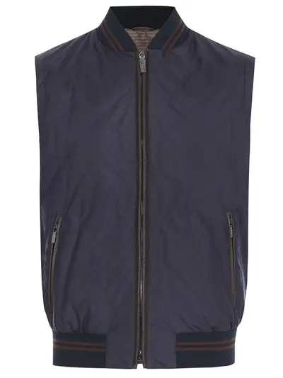 -Стеганый жилет из шелка темно-синего цвета от HETTABRETZ. -Эластичный воротник-стойка и пояс по низу изделия с полосатым мотивом, прорезные карманы на молнии, застежка-молния, отделка деталей из натуральной кожи.