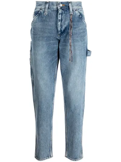 blue cotton straight leg faded effect logo patch to the rear belt loops front button and zip fastening classic five pockets