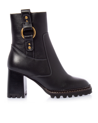 Полусапоги Erine из новой коллекции See by Chloe выполнены из натуральной кожи черного цвета. Пара на высоком наборном каблуке с закругленным мысом и зубчатым рантом. Обувь с застежкой на молнию дополнена фирменной гравировкой бренда в виде кольца. Резиновая подошва с глубоким протектором.