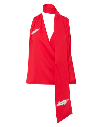 Топ из весенне-летней коллекции выполнен из вискозы красного оттенка с вышивкой-губами и отделкой кристаллами. Модель прямого силуэта с V-образной линией выреза и деталью вокруг шеи из основного материала.