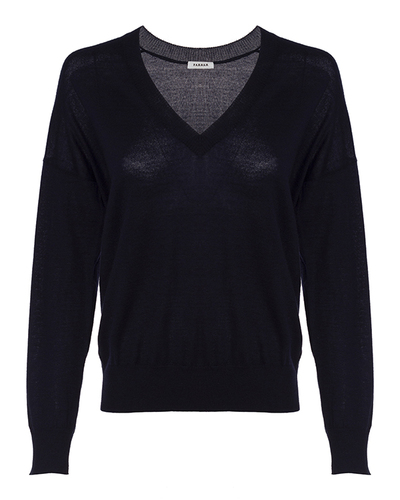 Базовый пуловер из тонкого кашемира темно-синего оттенка. Изделие с V-образным вырезом и спущенной линией плеч. Уплотненная отделка манжет, линии низа и выреза.